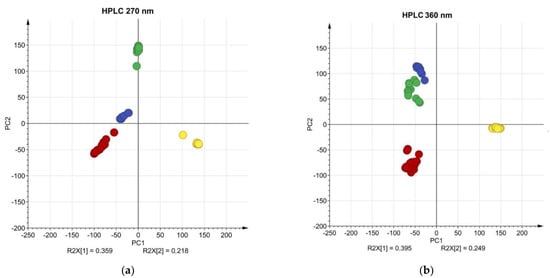 PCA clusters for analyzed medicinal plants. (a) PCA clusters for raw HPLC data detected at 270 nm (yellow—roselle, red—chamomile, green—yarrow, blue—calendula); (b) PCA clusters for raw HPLC data detected at 360 nm (yellow—roselle, red—chamomile, green—yarrow, blue—calendula).