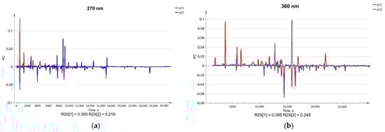 At 270 nm PC1 describes 35.9%, but PC2—21.8%, forming 57.7% of a total variance for the chromatographic information, while at 360 nm PC1 describes 39.5%, but PC2—24.9%, forming 64.4% of chromatographic information. A combination of the first ten components describes 95% (R2(X) 95.2%, Q2 92.4% at 270 nm, and R2(X) 95.7%, Q2 93.7% at 360 nm) of the composition of herbal compounds. The main differences in chemical composition are described by the PC1 and PC2, while later components have a smaller impact. The first two components at 270 nm describe a smaller portion of chromatographic information than at 360 nm, suggesting that at 270 nm more differences in chemical profiles were observed. PC1 can be used only to differentiate the roselle samples, while PC2 shows differences in the chemical composition of yarrow, calendula, and chamomile. Additionally, the loadings of PC2 at 270 nm wavelength describe more differences in chemical composition than at 360 nm, proving that data detection at 270 nm is superior for the differentiation of medicinal plants (Figure 6). From the PCA, we could see that the roselle cluster is the furthest from other clusters, suggesting its chemical composition is different to other investigated plants (Figure 5).