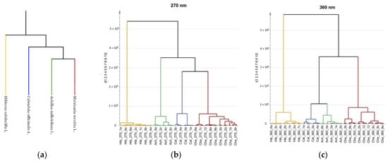 A correlation between the phylogenetic relationships and groupings of fingerprint datasets was also confirmed in HCA (Figure 7). Latvian native medicinal plant samples are located on one branch of the dendrogram, while roselle samples are on another branch, the same as in the phylogenetic tree. However a difference from the phylogenetic tree in HCA was seen for Latvian native medicinal plants (yarrow, calendula, and chamomile). In the phylogenetic tree, chamomile and yarrow share a more recent common ancestor than either one share with calendula (Figure 7a). That suggests that the chemical composition of yarrow and chamomile should be more alike. But the HCA proves otherwise—samples of chamomile are located closer to calendula samples in the dendrogram at 270 nm and samples of yarrow and calendula are grouped together at 360 nm, suggesting a more similar chemical composition, respectively (Figure 7). As previously mentioned, the chemical composition can be impacted by many factors, including the origin of samples, soil, growth conditions, and other reasons, which could have impacted this result []. Further research with larger sample sizes should be conducted to investigate this observation. In a study done by Kharyuk et al. a correlation was found between evolutionary relationships and herbal fingerprints for closely related species with samples made from similar parts, but groupings of higher order were not accurate []. The distance between clusters is larger at 270 nm, making the method superior for the identification of medicinal plants and for providing distinctive chemical profiles.