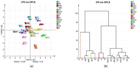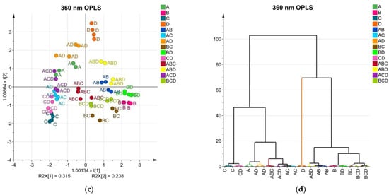OPLS scatter plots and dendrograms for HPLC data of mixed extracts: (a) OPLS dendrogram of HPLC data of mixed extracts at 270 nm; (b) OPLS dendrogram of HPLC data of mixed extracts at 270 nm; (c) OPLS dendrogram of HPLC data of mixed extracts at 360 nm; (d) OPLS dendrogram of HPLC data of mixed extracts at 360 nm.