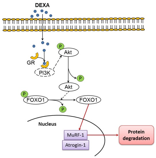 - Zhao, W.; Qin, W.; Pan, J.; Wu, Y.; Bauman, W.A.; Cardozo, C. Dependence of dexamethasone-induced Akt/FOXO1 signaling, upregulation of MAFbx, and protein catabolism upon the glucocorticoid receptor. Biochem. Biophys. Res. Commun. 2009, 378, 668–672. [Google Scholar] [CrossRef]