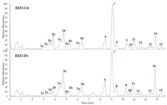 The identification of the phenolic compounds in tomato peel from plants grown in normal (RED-Ctr) and in drought stress (RED-Ds) conditions was performed by UHPLC analyses, coupled to ESI-HR-MS. The chromatograms shown in Figure 2 evidenced a very similar profile with 15 identified phenol derivatives. Both extracts are rich in phenolic acids (compounds 1–5, 11, and 13) and flavonoids (compounds 6–10, 12, 14, and 15). All compounds were identified by comparison of full MS and fragmentation patterns with literature data, except for chlorogenic acid (3a and 3b isomers), rutin (7), and naringenin (9), confirmed by injection of reference standards (Table 1). Results were in agreement with the phenol composition in tomato peels previously reported [,,].