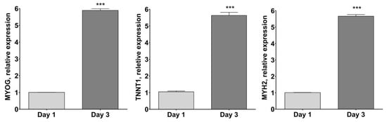 As reported in Figure 4, MYOG, TNNT1 andMYH2 mRNA expression resulted in significantly higher differentiated human myotubes after 3 days of culture in the differentiation medium (p < 0.001 vs. day 1).