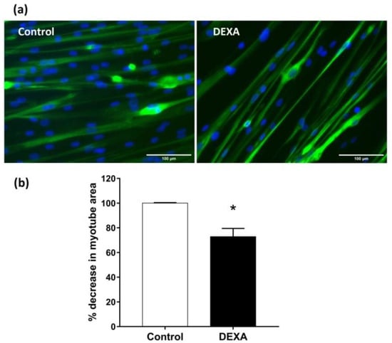 Induction of atrophy in HSMM myotubes. (a) Differentiated myotubes were treated with 50 µM of DEXA for 48 h. Representative images of MYH2/Hoechst-labeled myotube (green/blu). (b) Plots of the percent decrease, from untreated cells, in myotube area, are shown. Plots represent means ± SEM, n = 10. * p < 0.05 vs. untreated cells (control) using Student’s t-test. (Images at ×20 magnification; scale bar = 100 microns).