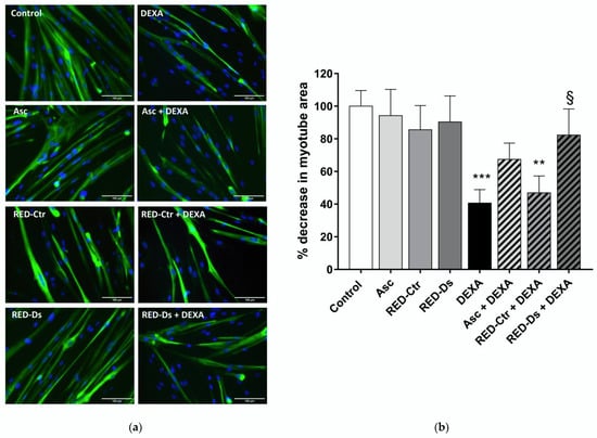 Total myotube areas were measured as a percent decrease in untreated myotube area, in order to evaluate muscle atrophy. Results are reported in Figure 6. Data showed that both RED-Ds and RED-Ctr alone do not alter myotube area compared to untreated cells. Moreover, 5 µg GAE/mL TPC of RED-Ds extract showed a protective effect on muscle atrophy, induced by 50 µM DEXA (Figure 6b). As showed in the bar graph, DEXA induced statistically significant decreases in myotube area over untreated control cultures. When cells were pre-treated for 2 h with RED-Ds and then co-incubated with DEXA for 2 days, the decrease in myotube area induced by DEXA was not observed.