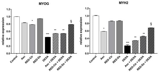 Gene expression of late Myosin heavy chain-2 (MYH2) and Myogenin (MYOG) muscle cell markers, normalized to three most stable reference genes, eEF1a, RPL13a and B2M, (Avg M value = 0.269). The 2−ΔΔCt algorithm was applied for relative quantification in differentiated myotubes. Differentiated myotubes were treated with 50 µM of DEXA or with 5μg GAE/mL (TPC) of ascorbic acid (Asc) and Rosso di Pitigliano (RED) extracts of plants grown in normal (RED-Ctr) or in drought stress conditions (RED-Ds), for 48 h. Data show relative expression to the untreated cells (control). * p < 0.05, ** p < 0.005 and *** p < 0.001 vs. control; § p < 0.05 vs. DEXA using one-way ANOVA.