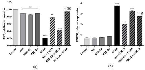 When cells were treated with RED-Ds or Asc, the negative effect of DEXA on Akt mRNA expression was reduced and a significant decrease in FOXO1 mRNA expression was observed (p < 0.005 vs. DEXA), (Figure 8a).
