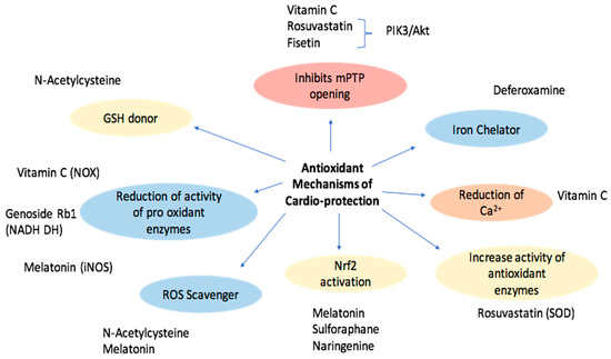 Schematic representation of the different cardioprotective effects of antioxidants and related molecules.