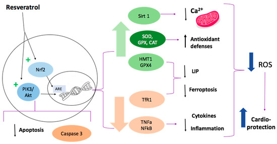 Representation of resveratrol cardioprotective effect. Resveratrol activates the Nrf2 signaling pathway, increasing the expression of antioxidant enzymes. It also reduces the expression of pro-apoptotic proteins, such as caspase 3, via the PI3K/Akt pathway. Other effects are the reduction of inflammation and ferroptosis, which has been associated with reduced expression of TNFα, NfκB, TfR1, and increased activity of GPX4 after administration of resveratrol. The activation of SIRT1 is related to a decrease in intramitochondrial calcium concentration, which diminishes mitochondrial ROS production.