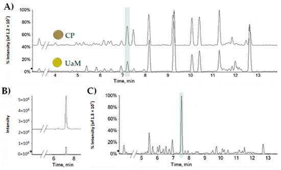 (A) TICs (Total Ion Chromatograms) of UaM and CP hemp seed oils; (B) XICs (eXtracted Ion Chromatograms) of the ion at m/z 357.2071 ± 0.0025; (C) representative TIC of leaf hemp sample collected at seed harvesting time.
