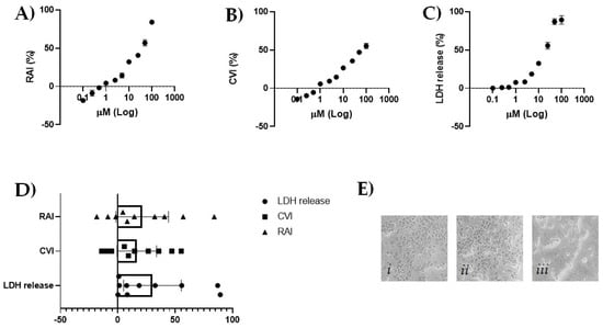 (A) Redox mitochondrial activity inhibition (%) by means of MTT data; (B) cell viability inhibition (%) by SRB assay data; (C) LDH release (%) by LDH assay data. Values are the mean ± SD of two independent experiments. Six replicates were performed in each experiment. (D) Scatter plot of data from the three different cytotoxicity assays with a representation of their 95% confidence limits using Graphpad Prism 8 software (Graphpad Software, La Jolla, CA, USA). (E) Representative images, acquired by Inverted Phase Contrast Brightfield Zeiss Primo Vert Microscope, of (i) untreated HaCaT cells; (ii) CBDA 2.5 μM treated HaCaT cells; (iii) CBDA 25 μM treated HaCaT cells.