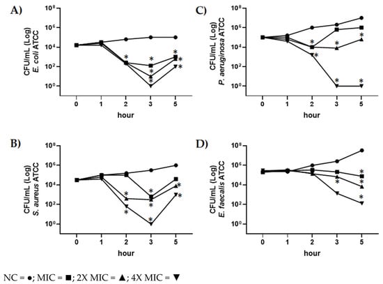 The time killing studies of CBDA against E. coli ATCC 13762, S. aureus ATCC 6538 and P. aeruginosa ATCC 27853 and E. faecalis ATCC 29212 were performed. Different CBDA concentrations were used (i.e., MIC, 2XMIC, 4XMIC values), and bacteria were analyzed at different incubation times (1, 2, 3, 5 h); data obtained are shown in Figure 4.