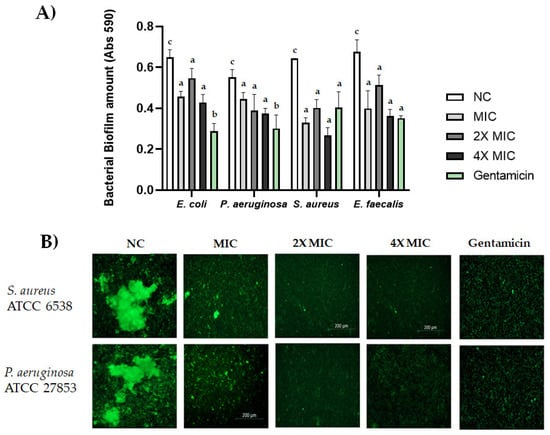 (A) Activity of CBDA against biofilms of E. coli ATCC 13762, S. aureus ATCC 6538, P. aeruginosa ATCC 27853 and E. faecalis ATCC 29212. CBDA was tested for inhibition of biofilm formation at concentrations corresponding to MIC, 2X MIC and 4X MIC against E. coli ATCC 13762, S. aureus ATCC 6538, P. aeruginosa ATCC 27853 and E. faecalis ATCC 29212. NC: negative control. Gentamycin (0.2 µg/mL) was used as positive control. Data were expressed as the mean ± SD of three individual experiments. Multiple comparisons were performed by ANOVA. Different letters (a, b, c) indicate significant differences at p < 0.05 analyzed by ANOVA. (B) Biofilms of S. aureus ATCC 6538 and P. aeruginosa ATCC 27853 were grown in 24-well plates for 24 h in the absence (NC) or presence of CBDA and stained with the LIVE/DEAD bacterial biofilm kit (SYTO-9 staining).
