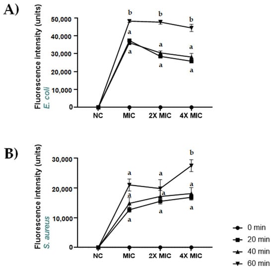 Membrane permeabilization induced by CBDA in S. aureus ATCC 6538 and E. coli ATCC 13762. Dose–response curves of membrane permeabilization of (A) S. aureus ATCC 6538 and (B) E. coli ATCC 13762, measured by SYTOX Green fluorescence. Basal values at 0 time are coincident with basal fluorescence intensity axis, where measures are indicated in a non-proportional scale. Bacterial cells were suspended in distilled water and treated with CBDA for 0, 20, 40 and 60 min, whereupon fluorescence was measured. Values are means with standard error bars of triplicate measurements and correspond to one representative experiment of the three. Multiple comparisons were performed by ANOVA. Different letters (a, b) indicate significant differences at p < 0.05 analyzed by ANOVA. NC: negative control.