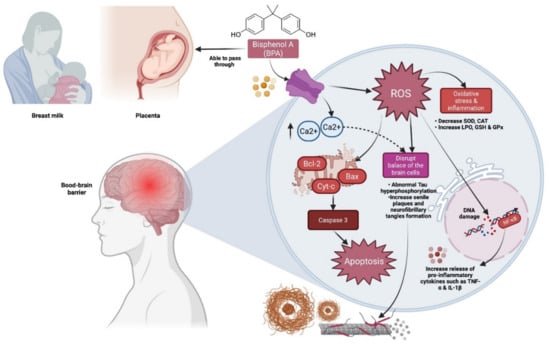 Cognitive impairments caused by BPA have a specific mechanism. BPA can travel past the placenta, the blood–brain barrier, and into breast milk, where it can be passed on to neonates. BPA also elevates reactive oxygen species (ROS) and intracellular calcium (Ca2+), which can lead to hyperphosphorylation of Tau, neurofibrillary tangles, and senile plaques development, resulting in dementia or Alzheimer’s disease (AD). Additionally, BPA has been linked to increases in oxidative stress, inflammation, and apoptosis in cells.