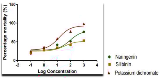 Using a Pasteur pipette, 10–15 nauplii were removed from the hatching chamber and were placed in the 24-well plates. The procedure was performed using a Pasteur pipette and a microscope. During the larval passage, a volume of no more than 1 mL should be transferred to avoid affecting the overall volume of the test system []. Silibinin and naringenin, as well as a positive control (potassium dichromate), were prepared in various concentrations (0.1, 1.0, 10.0, 100.0, and 1000.0 µg/mL) and 0.5 mL was added to each well containing sea water and kept at room temperature for 24 h to allow adequate contact with active nauplii in the well plates. After 24 h, the number of surviving nauplii in each well was counted. The percentage of larvae that died in the test and control systems was determined by comparing the mean survival rate of the two systems. The best-fit line plotting concentration versus lethality yielded the values for a lethal concentration of 50% (LC50) [].