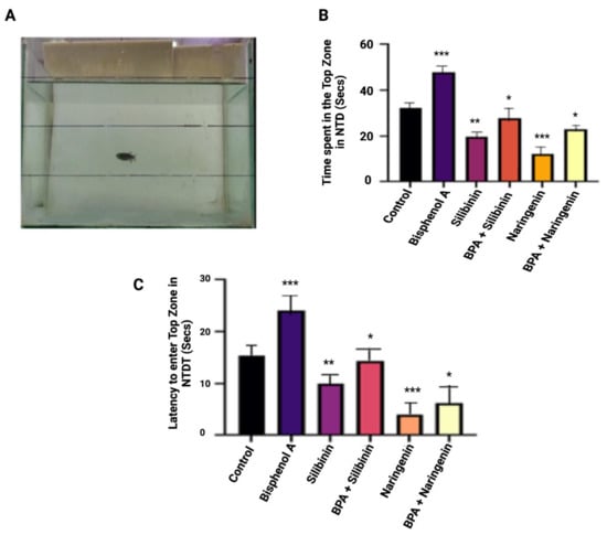 In NTDT, BPA-exposed groups spent more time in the top zone as compared to control groups, suggesting that the duration spent in the top zone increased. In the BPA-exposed group, the delay in the top zone entry was much lower than that in the control group. When compared to the BPA-exposed group, co-supplementation of silibinin and naringenin significantly decreased the BPA-induced modification in the time spent in the top zone and the latency in entering the top zone, indicating a neuroprotective effect. The findings of this study clearly indicate that silibinin and naringenin have potential neuroprotection effects against BPA-induced neurobehavioural abnormalities (Figure 4).