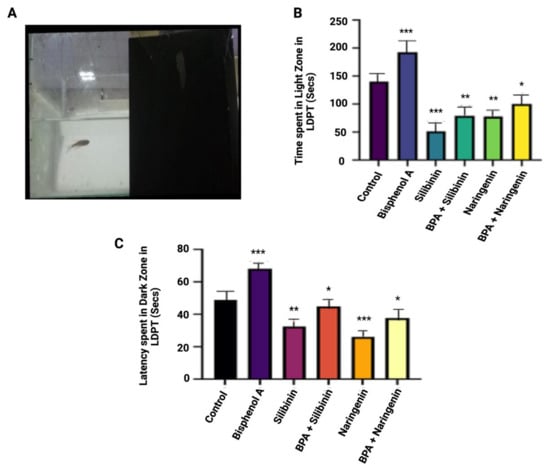 During the light and dark tests, the control group spent 137 s in the light compartment, which was separated into light and dark zones. In the light compartment, all control fish lasted fewer than 150 s. Following chronic waterborne BPA exposure and flavonoid co-supplementation, silibinin and naringenin treatment groups lasted for 130 s and 151 s, respectively, during the latency to reach the dark zone test in a 5-min session in LDPT. In comparison to the control, chronic waterborne exposure to BPA significantly affected the scototaxis behaviour of zebrafish, as evidenced by the increased transition to the light zone and the duration spent in the light zone. In LDPT, BPA exposure resulted in a significant increase in the latency to enter into the dark zone as compared to the control groups (Figure 5). In comparison to the BPA group, silibinin and naringenin significantly improved the altered scototaxis behaviour of zebrafish in the BPA + silibinin and BPA+ naringenin groups.