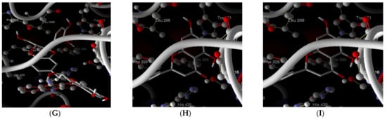 (A) Ligands in the workspace of MVD. (B) Crystal structure of AChE complex that binds to ligand in the cavity (green). (C) Donepezil docked with AChE. (D) Silibinin docked with AChE. (E) Naringenin docked with AChE. (F) Crystal structure of BChE complex that binds to ligand in the cavity (green). (G) Rivastigmine docked with BChE. (H) Silibinin docked with BChE. (I) Naringenin docked with BChE.