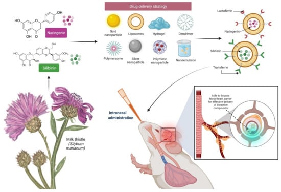 Drug delivery strategy of silibinin and naringenin through the intranasal route. Large compounds addressing developing CNS disorders are unable to reach their target due to the blood–brain barrier (BBB). One of the most promising methods of delivering phytochemicals to the brain is via the use of liposomes functionalised with transferrin (Tf) or lactoferrin (Lf). Transferrin binds to the Tf Receptor (TfR) on brain endothelial cells, while lactoferrin binds to the Lf Receptor (LfR). Both allow bioactive substances such as silibinin and naringenin to cross the BBB via transcytosis, further enhancing their bioavailability and efficacy while reducing toxicity.