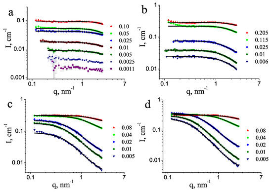 As can be seen in Figure 1a,b, some increase in the scattering intensity occurred in the region of small q values ( nm) for the high concentrations of 11.5 wt% and 20.5 wt%, which did not follow the smooth behavior characteristic of swollen polymer chains. This excess scattering can be related to the presence of a small amount of scattering objects, distinct from the polymer chains dissolved down to the molecular level. These objects are most likely clusters of polymer chains or undissolved polymer aggregates, making the studied samples two-phase systems. Because of their large size, only the tail of the scattering signal from the clusters was detected in the q range covered in the present experiment. Their minimal size can be estimated as ≈30 nm [26]. The equilibrium structure of the polymer solutions is reflected in the region of larger scattering angles, for q > 0.2 nm, and these data were used for the further analysis. We discuss the dilute and the concentration regions separately in the following sections.
