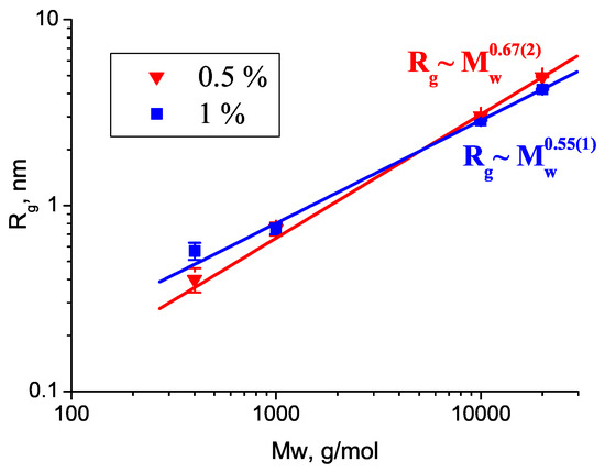 In the dilute solutions, the radius of gyration can be related to the polymer chain length, by considering the non-interacting PEG molecules as ideal Gaussian coils, for which , where N ≈ 3.9, 9.9, 98.7, and 197.4 (for PEG 0.4 kDa, 1 kDa, 10 kDa, and 20 kDa, respectively) are the number of chain segments and 0.78 nm is the size of the segment, taken as the Kuhn length as determined by viscosimetry [46]. This gave the following estimated values for : 0.63, 1.0, 3.2, and 4.5 nm for PEG kDa, 1 kDa, 10 kDa, and 20 kDa, respectively, which were close to the experimentally found values of , , , and nm for the lowest concentration of wt%.