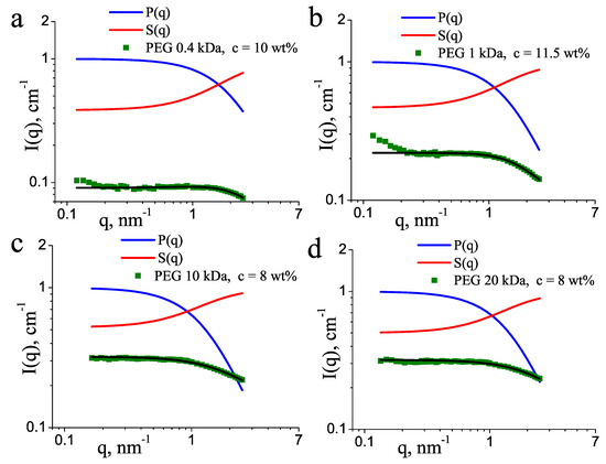 Experimental SANS data for aqueous solutions of PEG kDa, 1 kDa, 10 kDa, and 20 kDa are shown in Figure 1. At small polymer concentrations, the scattering curves correspond to the form factor of the polymer chains and are well approximated by the form factor of a Gaussian coil [23]. For large concentrations, the interference between neighboring polymer chains led to a decrease of the intensity in the low q range and the scattering data can be modeled by taking into account the structure factor.