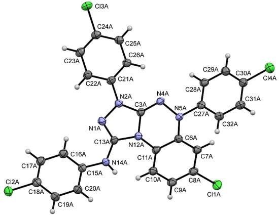 Oxidative cyclization of amidrazone 1l also resulted in the formation of two compounds 6l and 7 in moderate yields, although both of these derivatives were found to possess an unpaired electron (Scheme 5). Based on the EPR and HRMS data, the structure of 6l was assigned as the corresponding Blatter radical. The formation of Blatter radicals from amidrazones 1k,l is arguably attributed to the presence of electron-donating p-tolyl and p-chlorophenyl moieties at the N(1) atom of the benzo[1,2,4]triazine scaffold, while in the case of substrates 1i,j, the electron-withdrawing effect of the p-nitrophenyl substituent suppresses the oxidation to Blatter radicals. The structure of compound 7 was unambiguously confirmed by X-ray diffraction study and was characterized as dihydrobenzo[e][1,2,4]triazolo [3,4-c][1,2,4]triazine derivative (Figure 1). According to the EPR spectrum, compound 7 also represents an organic radical, although the corresponding signal is broadened due to the delocalization of the unpaired electron in the tricyclic system.