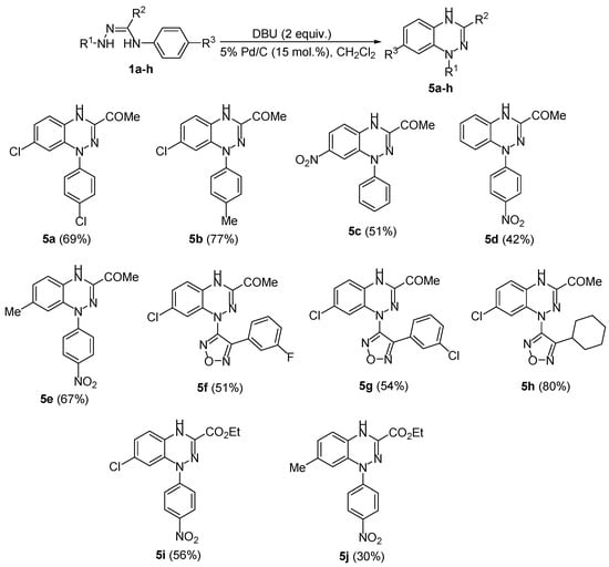 To further evaluate the scope of the observed transformation, other acetyl-substituted amidrazones 1b–h were subjected to the optimized reaction conditions. Aside from dichloro derivative 5a, benzotriazine 5b bearing electron-donor p-tolyl substituent was formed in a good yield. Importantly, amidrazones 1c–e incorporating electron-withdrawing p-nitrophenyl moiety either at the hydrazone or amine motifs also smoothly underwent cyclization to form corresponding heterocyclic products 5c–e (Scheme 3). Similar results were obtained in the case of 1,2,5-oxadiazolyl substituted substrates 1f–h, which confirmed the lack of influence of electronic effects of aromatic or heteroaromatic subunits on the cyclization outcome. In addition, 1,4-dihydrobenzo[e][1,2,4]triazines 5i,j, bearing an ester functionality at the C(3) carbon atom of the heterocyclic moiety and electron-withdrawing p-nitrophenyl fragments at the N(1) nitrogen atom, were obtained in fair yields under the same conditions. All compounds were fully characterized by IR, 1H and 13C NMR spectroscopy (see Supplementary Materials), as well as high-resolution mass spectrometry and elemental analysis.