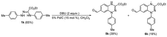 More intriguing results were obtained upon oxidative cyclization of amidrazones 1k and 1l. Introduction of substrate 1k into the studied transformation provided two compounds 5k and 6k in a ratio 2:1, both of which possessed a formyl functionality as a result of oxidation of one of the methyl groups in the p-tolyl motif (Scheme 4). According to the 1H and 13C NMR spectroscopy data, the structure of the major product was assigned to as benzo[1,2,4]triazine 5k. At the same time, the structure of compound 6k was determined as a Blatter radical, which was confirmed by the presence of the multiplet signal in the EPR spectrum and HRMS data.