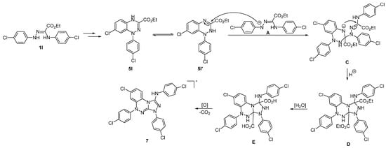 For the formation of the previously unknown compound 7, the following mechanism was proposed (Scheme 7). Introduction of amidrazone 1l into oxidative cyclization under standard reaction conditions affords benzo[1,2,4]triazine 5l, which tautomerizes to the N(2)H form 5l’ with subsequent nucleophilic addition of the amidrazone anion A. Intermediate C undergoes cyclization to the perhydro[1,2,4]triazolo[3,4-c][1,2,4]triazine derivative D. Hydrolysis of both ester moieties in D under traces of moisture affords intermediate E, which undergoes oxidative decarboxylation to the final dihydrobenzo[e][1,2,4]triazolo[3,4-c][1,2,4]triazine derivative 7.