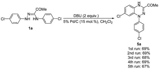 To further elucidate the synthetic utility of the developed protocol, we conducted a set of experiments on recycling of the Pd/C catalyst on the example of oxidative cyclization of amidrazone 1a. After the reaction was completed, the catalyst was filtered off, washed with organic solvents, and dried at 100 °C for 24 h until the constant mass in each case. It was found that the catalyst could be reused at least 5 times without loss of activity, which was confirmed by nearly equal yields of benzo[1,2,4]triazine 5a (Scheme 8).