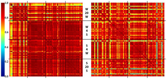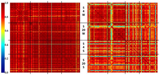 SSMs (normalized cosine dissimilarity) for the enhanced experiment (left—positive mode, right—negative mode), see Section 3.3 for details. The positive mode data do not show a difference between various storage conditions, while negative mode data are significantly more variable. Black lines divide the SSMs into sections corresponding to identical conditions. From top to bottom: S4W—storage media, saline; temperature, +4 °C; washing media, water. S20W—storage media, saline; temperature, +20 °C; washing media, water. S4S—storage media, saline; temperature, +4 °C; washing media, saline. S20S—storage media, saline; temperature, +20 °C; washing media, saline.
