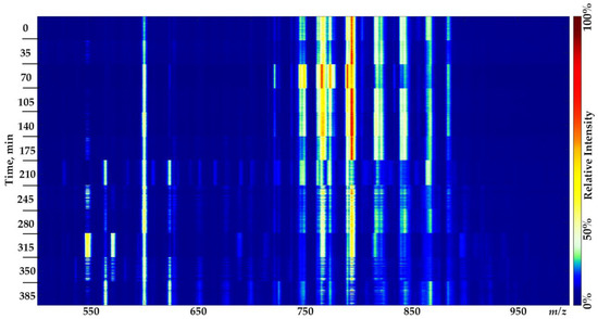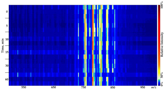 Ion map representing ICE molecular profiles obtained during the hour-long storage of rat brain tissue samples in normal saline at room temperature. Three samples from three animals per timestamp, positive mode. The intensity changes between measurements cause most of the visible alterations in spectra, while the overall molecular profile remains quite reproducible. The colormap has been adjusted for better visualization.