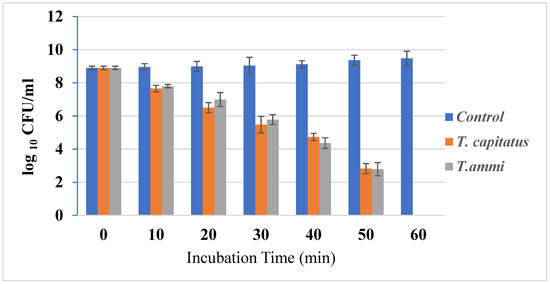 Time–kill studies allow one to characterize the antibacterial activity of two EOs by evaluating the reduction in bacteria count in the presence of extract at their MIC over several hours. In fact, the method described by Klepser et al. [48] and modified by Viljoen et al. [49] was used to evaluate the effect of T. capitaus and T. ammi EOs against E. coli strains by measuring the reduction in the number of CFU per milliliter over 24 h. The limit of quantification using this method is 102 CFU [50].