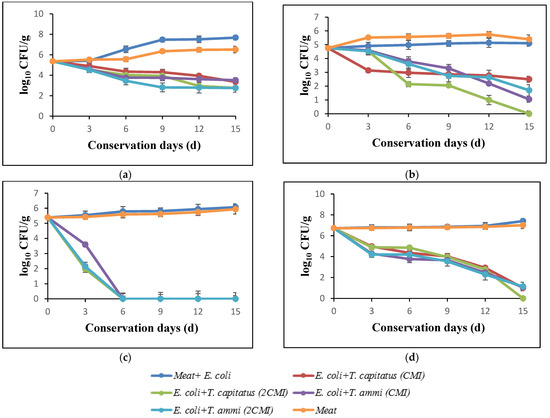 For food applications, concentrations of EO must be higher than those used in vitro antibacterial tests to achieve the same effect in food [34]. Thus, we chose two different concentrations of EOs of T. capitatus and T. ammi (MIC and 2 × MIC) to incorporate them into the minced turkey meat inoculated with E. coli strain C926, then studied their effects on the microbiological qualities of the meat during its conservation for 15 days.