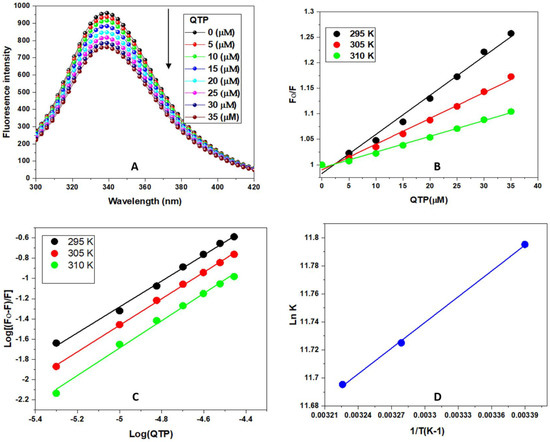 Fluorescence emission spectroscopy is a multipurpose biophysical technique used to study the binding mechanism of protein-ligand interactions and to evaluate the binding parameters [10,12,26]. The fluorescence emission spectra of HSA alone and the HSA-QTP complex are given in Figure 3A. It is apparent from Figure 3A that HSA exhibits a strong emission peak at 340 nm upon excitation at 295 nm due to W-214 residue. Further, the addition of different concentrations of QTP (0–35 μM) leads to the quenching of HSA fluorescence intensity without changing the peak shape. This fluorescence quenching suggests the formation of the HSA-QTP system and suggests a possible microenvironmental alteration in HSA upon treatment with QTP [33,34].