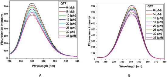 The synchronous fluorescence spectrometry helps to provide information about the local environment of proteins around W and Y residues upon interaction with ligands [30,39]. In this experiment, the fluorescence difference between excitation and emission wavelengths reflects the nature of the spectra. A difference of wavelength (Δλ) of 15 nm is characteristic for (Y), and 60 nm is typical of (W) residues. Therefore, any shift in the maximum emission wavelength reflects the local environment changes around aromatic amino acid residue (Y and W) [40]. The SFS emission spectra of the HSA-QTP complex are given in Figure 4A,B. It was clear from Figure 4 that the HSA fluorescence intensity of both (W and Y) regularly decreases with the addition of QTP. Further, no shift in the emission wavelength was observed for either of the spectra at Δλ = 15 nm or 60 nm. The HSA-QTP interaction did not lead to any microenvironmental change in the protein molecule upon interaction.
