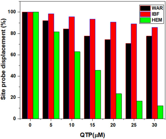 F1 and F2 represent the fluorescence emission intensities of the HSA-QTP system in the absence and presence of different site markers, respectively. However, the percentage of displacement values of the HSA-QTP complex against the different concentrations of site markers is shown in Figure 5. It is apparent from Figure 5 that the displacement percentage of QTP from HSA by hemin is appreciably higher than WAR and IBU. Thus, the binding site of QTP is predicted to be in site III (subdomain IB) of HSA.