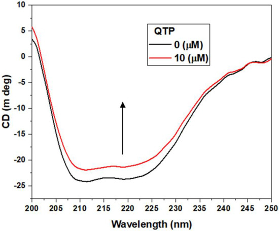 Circular dichroism spectra of HSA (5 μM) in the absence and presence of QTP (10 μM).