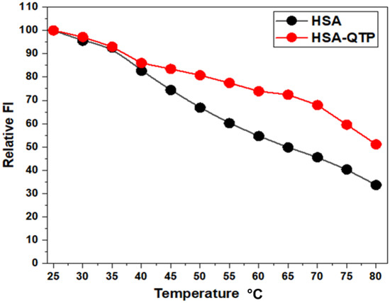 The binding of drugs to plasma proteins can increase the protein’s thermal stability [43]. Various studies have shown that drugs induced thermal stabilization to HSA [44,45]. Therefore, the thermal stability measurements of HSA were carried out at different temperatures in the absence and presence of QTP binding. The temperature-dependent titrations measurements were performed on HSA (5 µM) without or with QTP (50 µM) in different temperature range, 25–80 °C (5 °C intervals). Figure 7 shows the influence of temperature on the fluorescence intensity of the HSA and HSA-QTP system at 343 nm. In the presence of QTP at 45 °C, the decrease in FI of the HSA-QTP system was lesser than HSA alone. However, our thermal stability results demonstrated QTP-induced stability to HSA via QTP-HSA system formation (coupling of binding and unfolding equilibrium) [46].