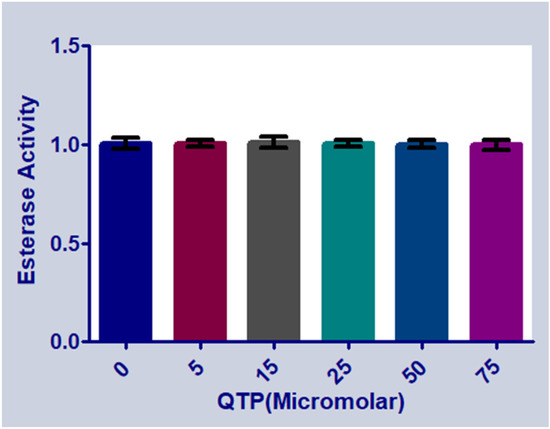 HSA is the most abundant protein in the blood plasma and possesses catalytic functions such as esterase-like activity [47]. Amino acid residues such as Arg-410 Tyr-41 (Sudlow’s site II (subdomain IIIA)) of HSA play a predominant function in esterase activity (Watanabe et al., 2000) [48]. However, the effect of QTP binding on the esterase-like activity of HSA is shown in Figure 8. It was observed that upon the addition of QTP (0–75 μM), there is no inhibiting effect on the esterase-like activity of HSA.