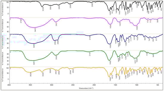 FTIR spectra of (1) SA, (2) GA, (3) PVP, (4) GA/PVP, and (5) GA/PVP/SA 2 mM. FT-IR, Fourier transform infrared spectroscopy; SA, salicylic acid; GA, gum arabic; PVP, polyvinylpyrrolidone.