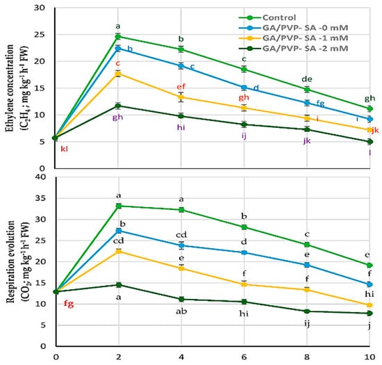 Figure 1 shows the differences in ethylene production and respiration rates of peaches during storage in shelf-life conditions. Each of the two gases rose to a maximum on the second day that is higher than the initial value. During the shelf-life continuance, ethylene increases clearly to a maximum of three times and, for the respiration, 2.5 times on the second day for the control treatment. The increases are independent according to the treatments. GA/PVP–SA 2 mM presented more inhibition in both ethylene and respiration throughout the experiment (Table 5). It recorded 11.17 and 14.57 mg kg−1 h−1 for both gasses on the second day of the shelf-life period. Consequently, it minimizes both ethylene and carbon dioxide production until up to the end of the storage time (Figure 2).