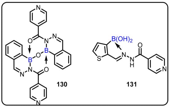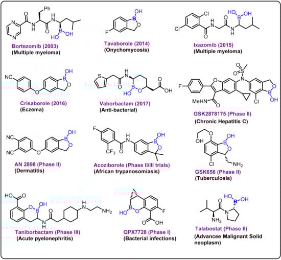 Due to its high electrophilic nature, the exogenous element boron and its compounds have been incorporated as key components in various drug candidates, and significant research has been reported over the last decade on the development of new boron-based scaffolds [1,2,3]. Boron has a remarkable ability to create stable electron-deficient three-center, two-electron bonds and strong covalent two-center, two-electron bonds. The covalent ligands present at the boron center can also form strong hydrogen bonds, which can improve effective coordination of active sites in a drug delivery process. In general, based on the literature, these bimodal interactions can be broadly classified into two categories: (i) primary and (ii) secondary interactions [4,5,6].The chemistry is evident from various studies on the behavior of boronic acid/ester present in various drug molecules [7,8,9,10,11,12]. Bortezomib (a dipeptide boronic acid), talabostat (a methanesulfonate salt of L-valinyl-L-boroproline), asborin (carbaborane analogue of aspirin), and tavaborole (a benzoxaborole) represent the remarkable advances in boron chemistry in the field of drug development (Figure 1). Bortezomib (Velcade)was the first boronic-acid-containing drug approved by the Food and Drug Administration (FDA) in 2003. This drug is a proteasome inhibitor that is used to treat multiple myeloma. Because of the overall beneficial properties of boronic acids, since the approval of Velcade, interest in boronic acids has grown in medicinal chemistry, leading to the discovery of two other drugs approved by drug authorities:ixazomib and vaborbactam. Ixazomib, approved by the FDA in 2015, is used to treat multiple myeloma and works via a mechanism similar to that of bortezomib. Vaborbactam, approved by FDA in 2017, is a β-lactamase inhibitor used in combination with antibiotics for the treatment of urinary, abdominal, and lung infections. Benzoxaborole-containing drugs tavaborole and crisaborole, approved by FDA in 2014 and 2017,are used for the treatment of onychomycosis and Eczema, respectively [1,13,14,15,16,17,18].