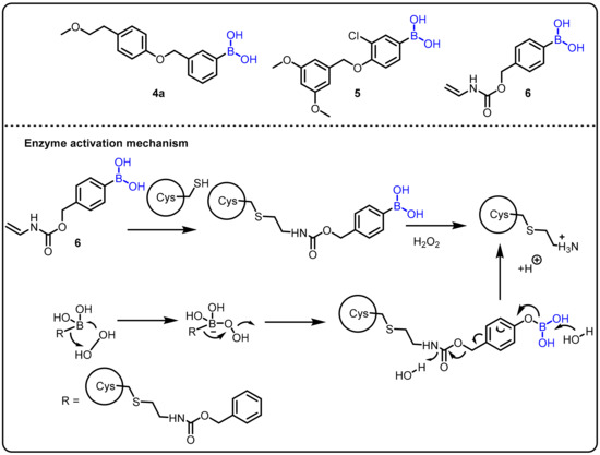 A fascinating feature of boronic acids is their ability to act as a serine trap. Hixon et al. studied the influence of various boronic acids against autotoxin [72]. Structurally similar to serine hydrolases, autotoxin is a phospholipase implicated in cardiovascular disease. Autotoxin has a catalytic threonine residue but stabilizes the transient oxyanion through bimetallic coordination and is therefore inhibited by boronic acids. Following the fragment-based screening (FBS) protocol, in comparison to the compounds previously reported by the Kawaguchi group [73], new compounds 4, 5, and 6 were proven to be potent (Scheme 2).