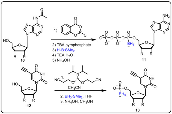 Various nucleoside analogues, such as 3-thia-2,3-dideoxycytidine (3TC), 3-azido-3′-deoxythymidine (AZT), and 2,3-didehydro-2,3- dideoxythymidine (d4T) have been found to actas antiviral agents targeted at the reverse transcriptase (RT) of HIV [75]. The absence of a 3′ hydroxyl group supportsviral DNA chain termination. Three major resistance mechanisms operate at the RT active sites for viral RT gene mutation to control DNA chain termination under therapeutic conditions; these can be described as: repair of the analogue-terminated DNA, discrimination of the analogue by a decreased affinity (Kd) for RT, and a decreased polymerization rate (kpol) [76]. In this regard, α-boranophosphate nucleosides (α-BH3-dNTPs), as analogues with one non-bridging oxygen on the phosphate substituted by a BH3¯ group, evolved as one efficient strategy to circumvent this resistance [77]. Canard et al. reported BH3-nucleotide analogues as HIV-1 RT inhibitors, having shown the ability to overcome reverse transcriptase-mediated drug resistance [78]. Furthermore, Shaw et al. explained the design and synthesis of cordycepin and 2′-o-methyl α-P-borano triphosphate by using a one-pot phosphorochloridite reaction under mild reaction conditions (Scheme 4) [28,79]. The α-P-borano compounds in which α-phosphateoxygen was replaced by borane were tested in cell culture and displayed potential as effective viral polymerase inhibitors. The overall goal of this project was to improve the antiviral potency of chain-terminating sugar and base-modified purine nucleoside versus the hepatitis C viral RNA-dependent RNA polymerase by using a combination of α-P-borano and nanogel drug delivery technology. Subsequently, a potent thymidylate synthase inhibitor was obtained using a similar boronophosphate scaffold.