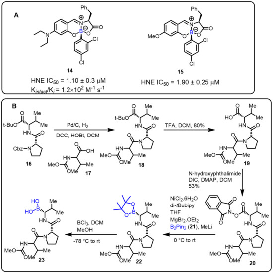 The Gois group described a novel one-pot approach for the synthesis of boron-containing bioactive scaffolds by the reaction of aryl boronic acids, salicylaldehyde, and amino acids to identify effective enzyme inhibitors. The developed protocol was applied for the discovery of human neutrophil elastase (HNE) inhibitors. Compounds 14 and 15 were found to be the most efficient among the tested substances, with IC50 values of 1.1 and 1.9 μM, respectively, against HNE [29]. Moreover, adetailed mechanistic investigation revealed that imine alkylation and lactone ring-opening are key features ofthe mechanism of inhibition (Scheme 5).