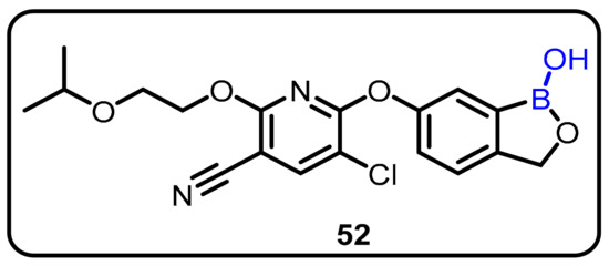 The development of a new series of 6-pyrrolobenzoxaboroles derived from 6-indolylbenzoxaboroles significantly improved overall antitrypanosomal activity [85,86,87]. SAR of this new class of oxaboroles revealed that interchanging the substituents from the pyrrolyl C(2′) to the C(3′) provided significantly more efficient antitrypanosomal 6-pyrrolobenzoxaboroles, with IC50 values as low as 0.03 μg/mL and good cytotoxicity profiles. The authors proposed that this could be effective against African trypanosomiasis, in which a fatal parasitic infection is caused by the protozoan Trypanosoma brucei. The synthesized compounds were evaluated for their antiparasitic activity and have shown good antiparasitic IC50 values, ranging from 4.02 to 0.03 μg/mL, with satisfactory cytotoxicity profiles. Among the tested compounds, compounds 49, 50, and 51 wererevealed to cure parasitic infection in a murine acute infection model, with complete clearance of the parasites in the blood (Scheme 13) [47].