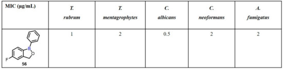Onychomycosis is a progressive fungal infection of the nail unit that causes toenail and fingernail destruction and abnormality [88]. Dermatophytes, a type of fungus that lives on the skin, hair, and nails and generates other cutaneous fungal infections, such as athlete’s foot, are the primary cause of onychomycosis. The most predominant dermatophytes are Trichophyton rubrum and Trichophyton mentagrophytes, which represent 60–90% of all cases. In this regard, Baker et al. synthesized a series of benoxaborole derivatives bearing aryl, heteroaryl, or vinyl substituents from 2-bromo-5-fluorobenzaldehyde or 2-bromobenzyl alcohol. The synthesized compounds were evaluated for their antifungal activity.Among them, compound 56 displayed a potent inhibitory activity against T. rubrum, T. mentagrophytes, C. albicans, C. neoformans, and A. fumigatus, with MIC values in the range of 0.25–1 µg/mL (Scheme 16) [89].